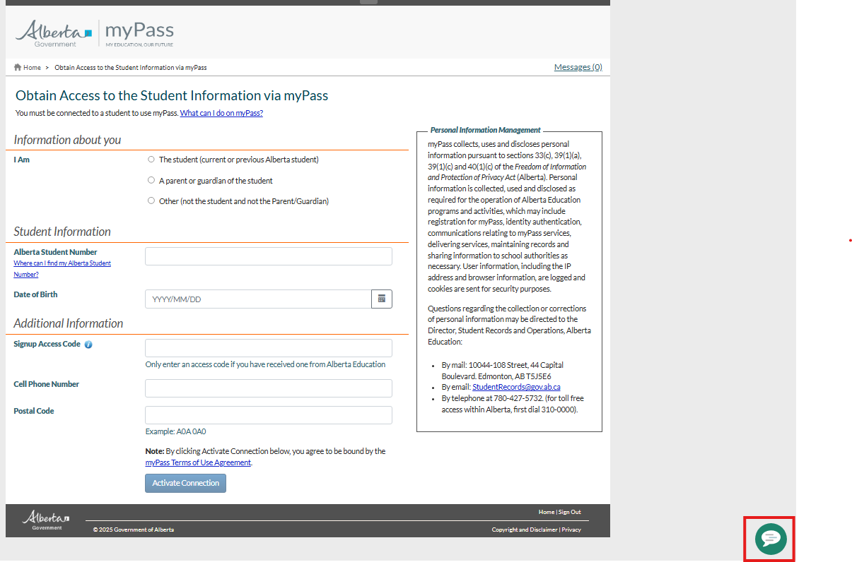 If the user does not have any active myPass Connectionss, then the user is automatically directed to Obtain Access to the Student Information via myPass page.