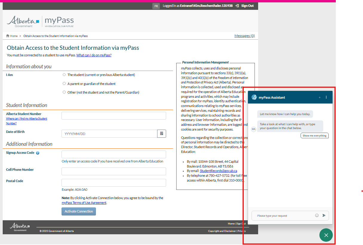 The myPass Virtual Agent is located in the bottom, right corner of all myPass pages. The myPass virtual agent is a software-based entity designed to simulate human-like interactions and assist users in various tasks through natural language processing and artificial intelligence.