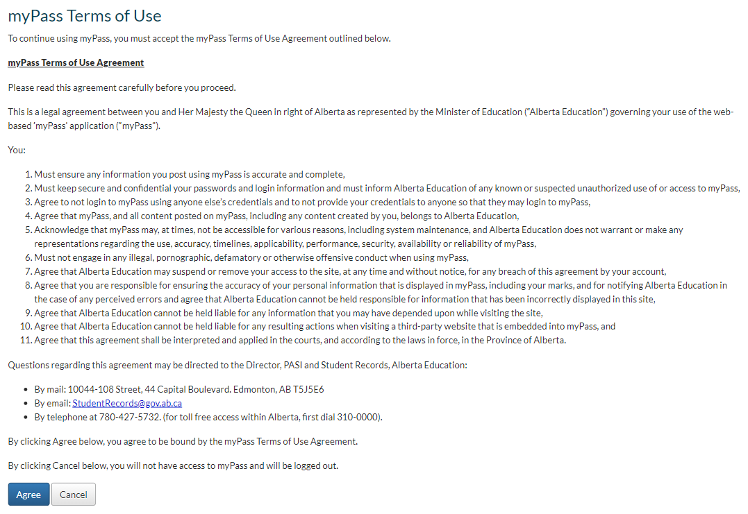 | By clicking Agree below, you agree to be bound by the myPass Terms of Use Agreement. | En cliquant sur Accepter ci-dessous, vous acceptez d’être lié par l’entente sur les conditions d’utilisation de myPass. |