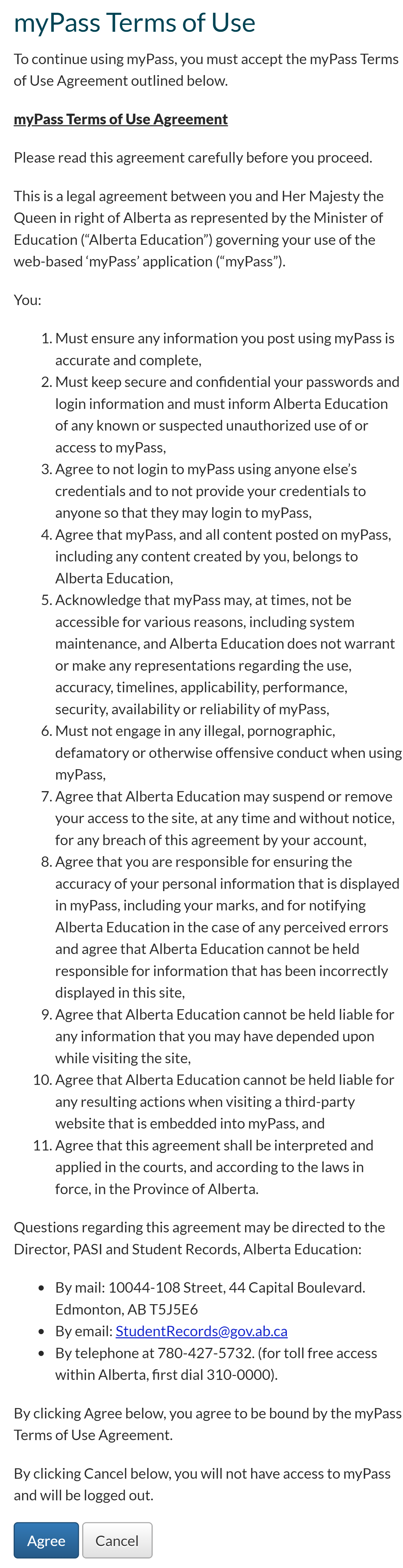 | To continue using myPass, you must accept the myPass Terms of Use Agreement outlined below. | Pour continuer à utiliser myPass, vous devez accepter l’entente sur les conditions d’utilisation de myPass décrite ci-dessous. |