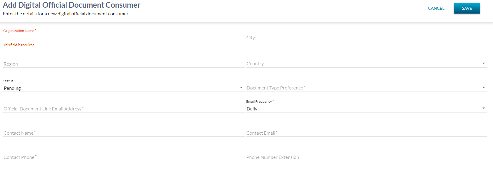 | Subtitle | Enter the details for a new Digital Official Document Consumer. |