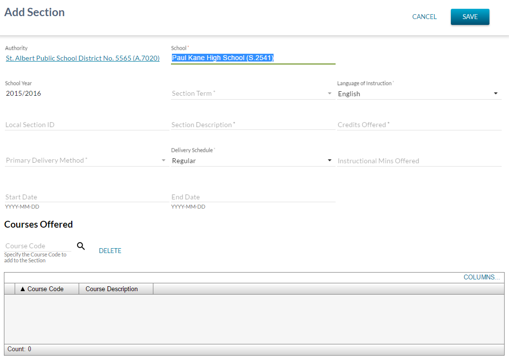 | Authority | Displays the name of the School Authority Code that has been defaulted to the Section. Formatted as “{Name}({Code})”. |