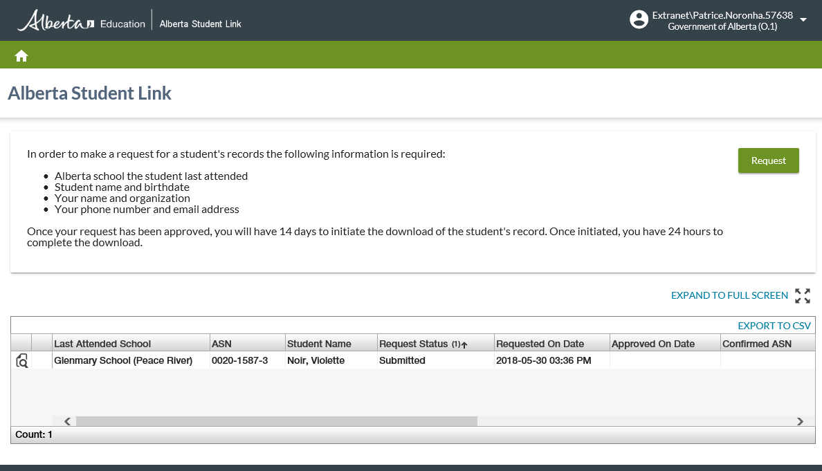 The user can click the view icon to see details of a specific request. Clicking the view icon will launch the View Request (Alberta Student Link) screen.