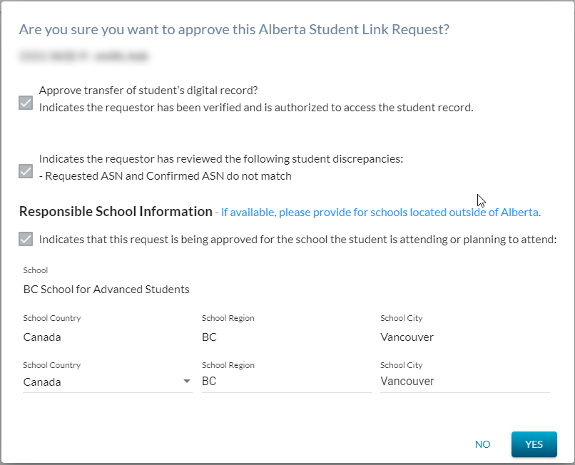 This is a dialog used in PASIprep for approving a Alberta Student Link Request.