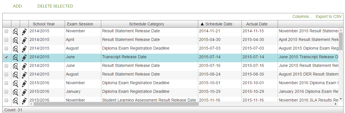 • There should be a column named “Authority”, “School”, or “Organization” (if the column could be either Authority/School/Others). This should follow the data format guidelines for an organization (e.g. “Edmonton School District No. 7 (A.3020)”) and link to the proper Alberta Education directory record. This column should be visible by default.