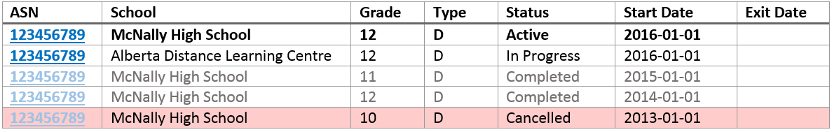 ASN Alberta Student Number tied to the record; note that this may be the secondary ASN. Links to View Student if user have access to that screen for that student.