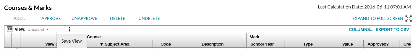 • Save - this action allows the user to save the column ordering, visibility, filtering and sorting they have selected and name the view with a title they choose.
