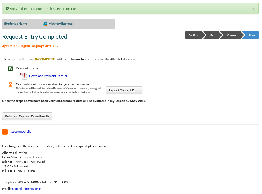 Refer to the View Rescore Request page for more details on content since the Done page and View Rescore Request page display the same content.