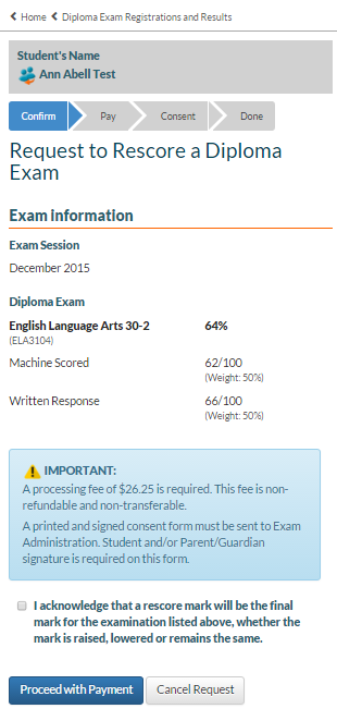 A myPass user may create Diploma Exam Rescore Request for any student they have an active myPass Connections to; the user will be guided through a series of screens to complete the process: