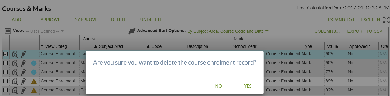 This page is accessed from where the user selects a student's Course Enrolment for deletion in the View Student - Courses & Marks tab: