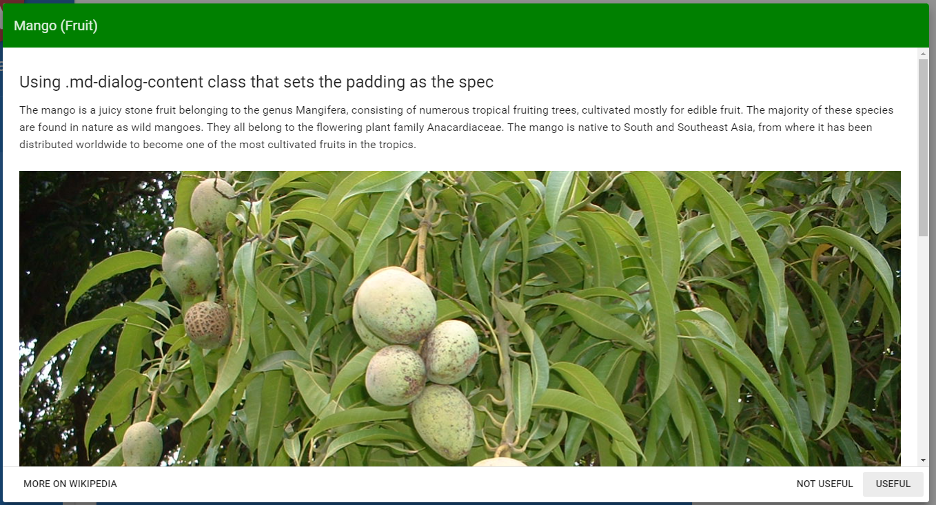 These dialogs should mimic the layout of the “Custom dialog” in the Angular Material dialog demo, without the top right corner [x] button to close the dialog (user cannot dismiss the dialog by clicking outside the dialog either).