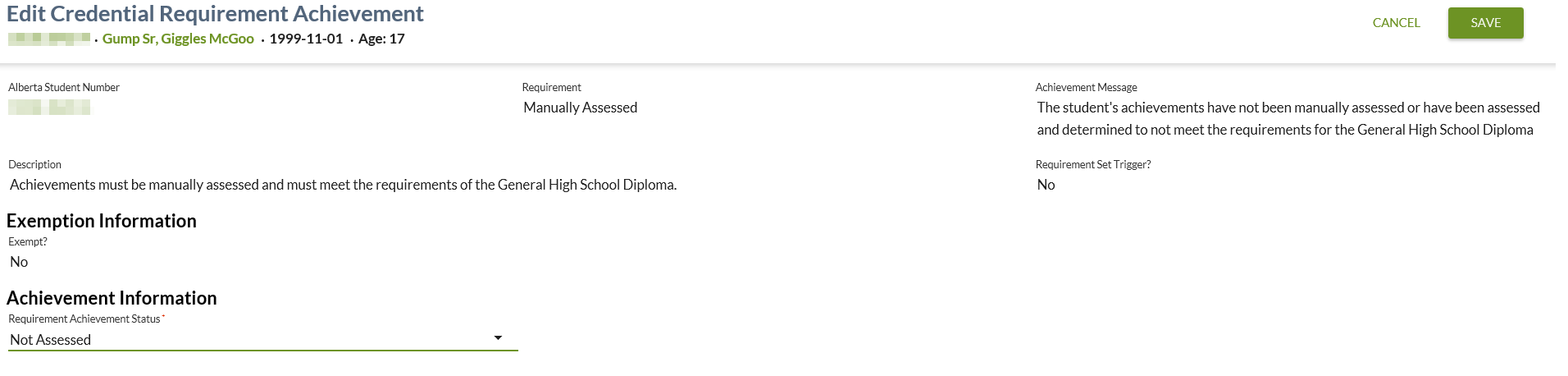 NOTE: Only Ministry Users can manually update the HSED Alt 1 requirements Student Requested Credential Assessment StudentRequested-81700 (Credential Requirement)