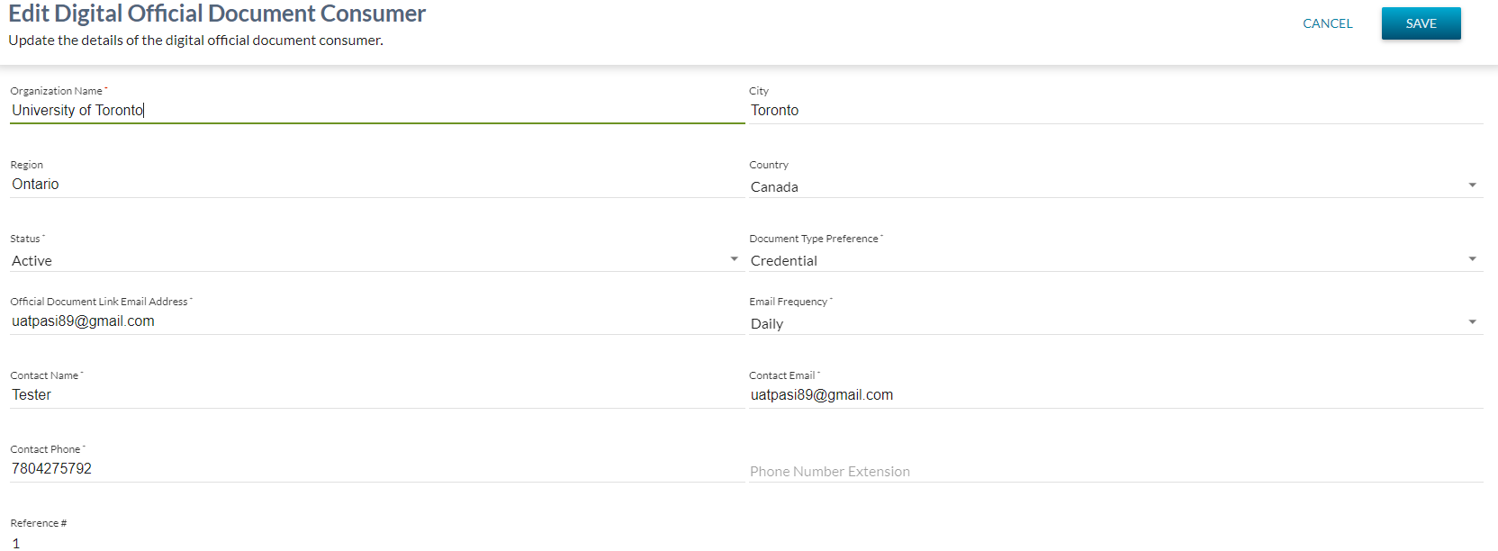 If the validation is successful, the Digital Official Document Consumer record will be updated based on the information entered by the user. The user will be returned to either the View Digital Official Document Consumer or the List Digital Official Document Consumers screen (depending on where the user came from).