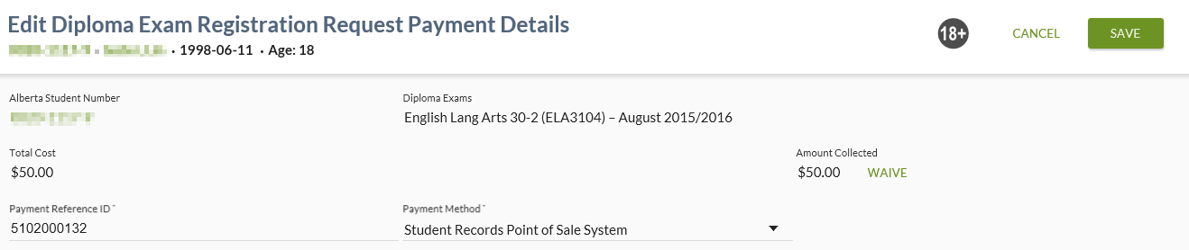 | Waive Reason | This is the Diploma Exam Registration Request Waive Reason on the Request * This is only shown if Amount Collected = $0.00 |