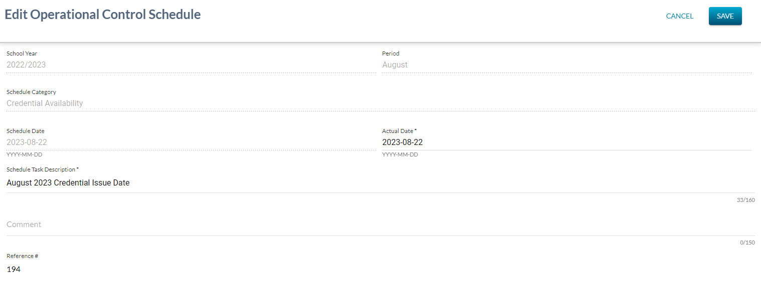 Access to the “Edit” screen is available from List Operational Control Schedules screen by clicking the pencil icon or from View Operational Control Schedule screen by clicking the “Edit” button.