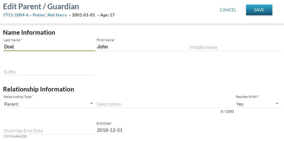| Relationship Type | Represents the Relationship Type (eg. Parent, Step Parent, etc). Dropdown List. Mandatory. |