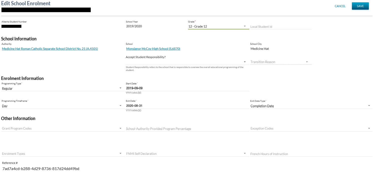 Users can access this screen where they have selected the edit action or icon for a school enrolment record.