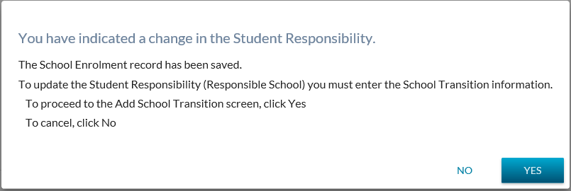If the school on the school enrolment is the Current Responsible School this field will default to ‘Yes’. | |