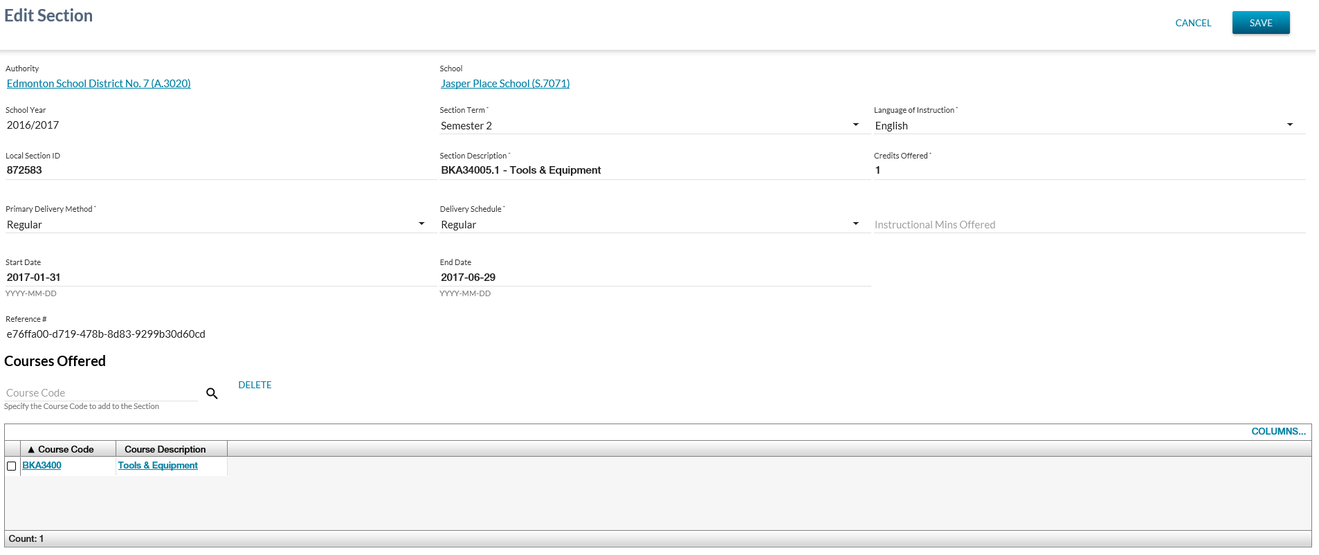 Refer to the Course Code Input Field Function section of the Add Section page for full details on this part of the edit page. It behaves the same way as on the add page.