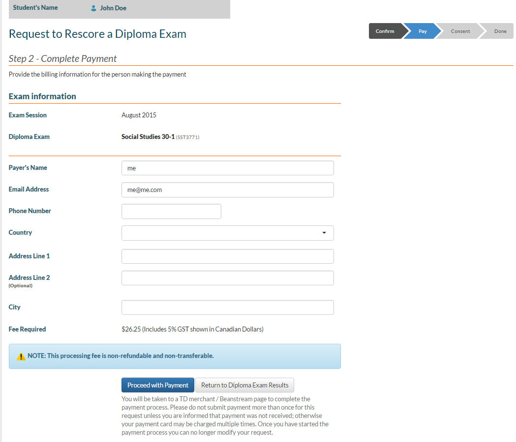 | Fee Required | The Diploma Exam Rescore Request Fee Amount Required + GST Due on the Exam Rescore Request |