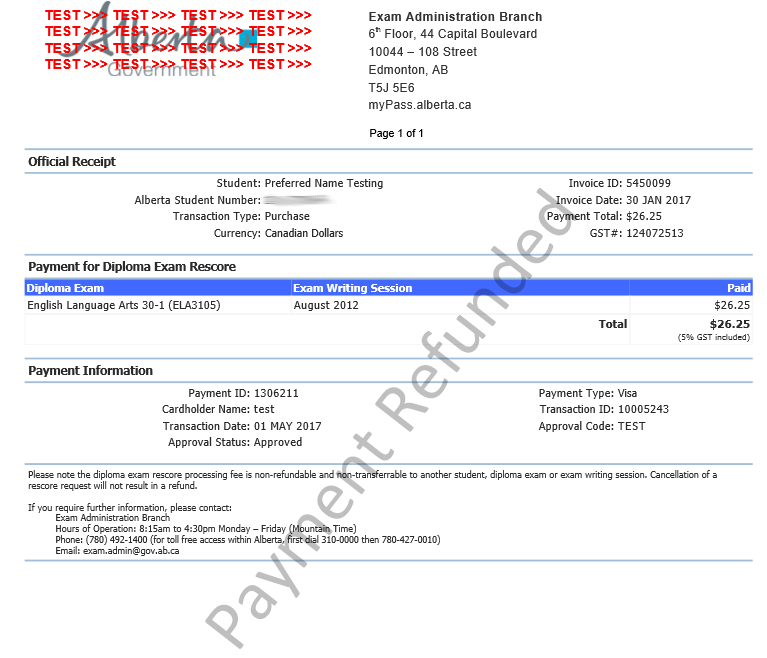 Where a refund has been applied to a student's rescore request by an Admin user, their receipt will reflect that refund using a “Refunded” watermark: