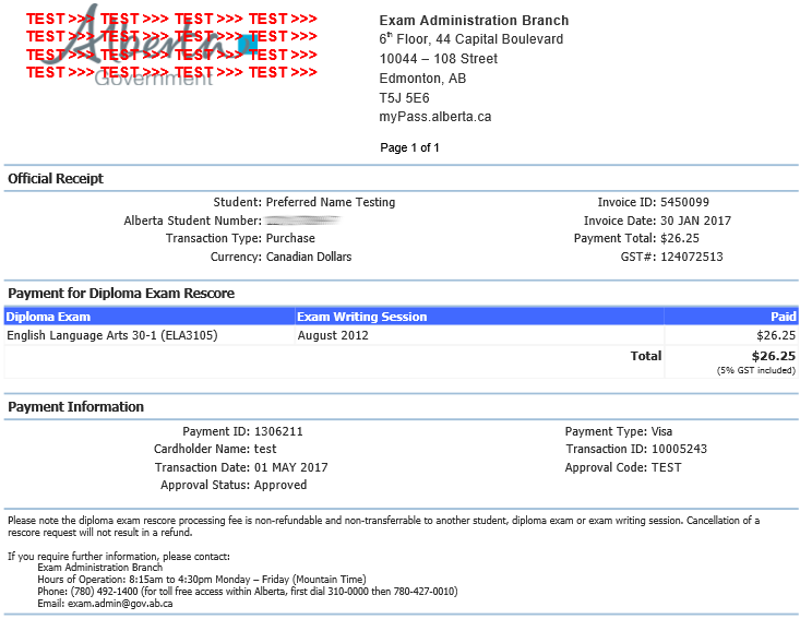 The header is similar to the header used in other receipts (see Payment Receipt Header Specification); however, a different header address (Exam Administration) is used for rescores.