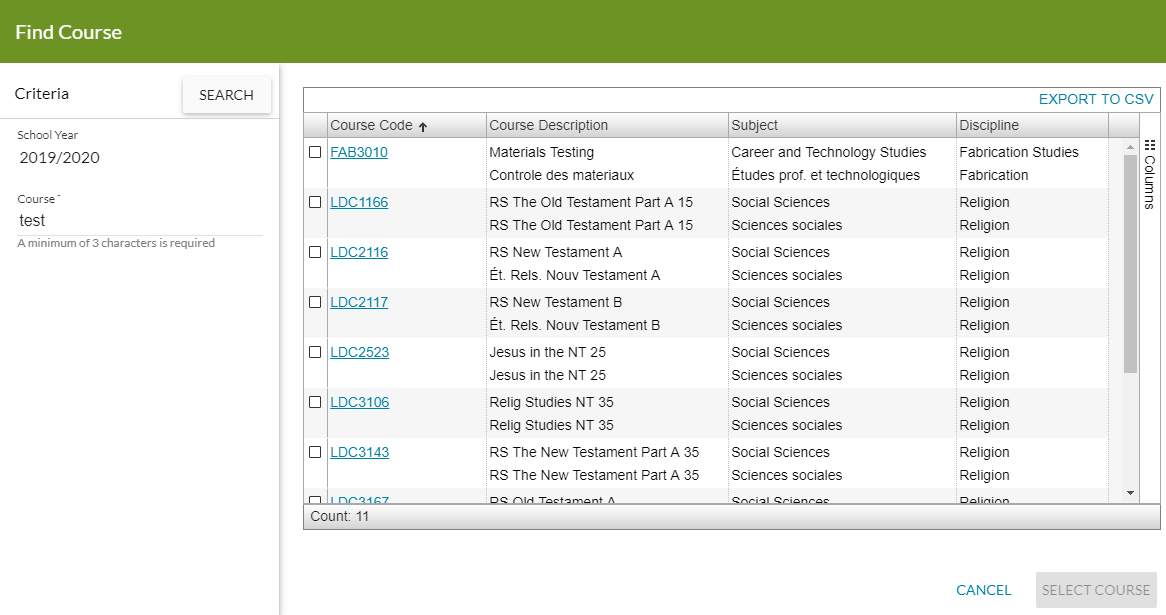The Find Course dialog allows a user to identify and select the required course when working with course information.