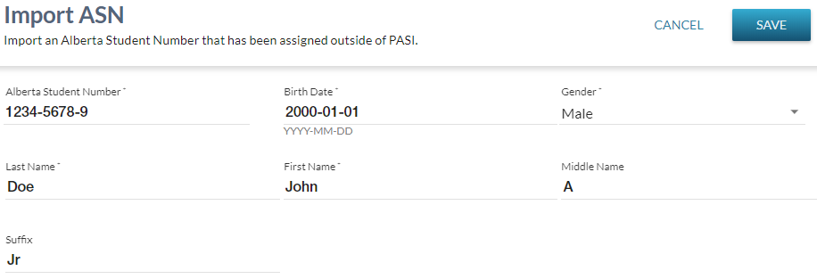This screen (based on the PASIprep Add Item Template) can be accessed via the List Student Synchronization Overrides screen and will allow a PASIprep user to add a new Student record that has already been assigned an ASN outside of PASI.