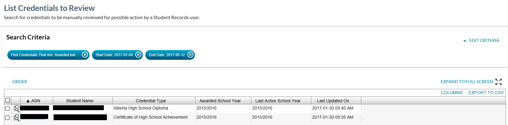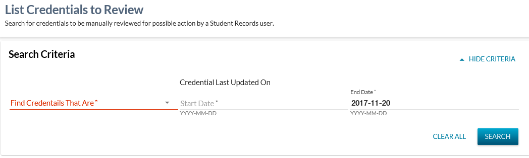 This screen has been designed for the Student Records business needs to find all credentials that should be considered for: