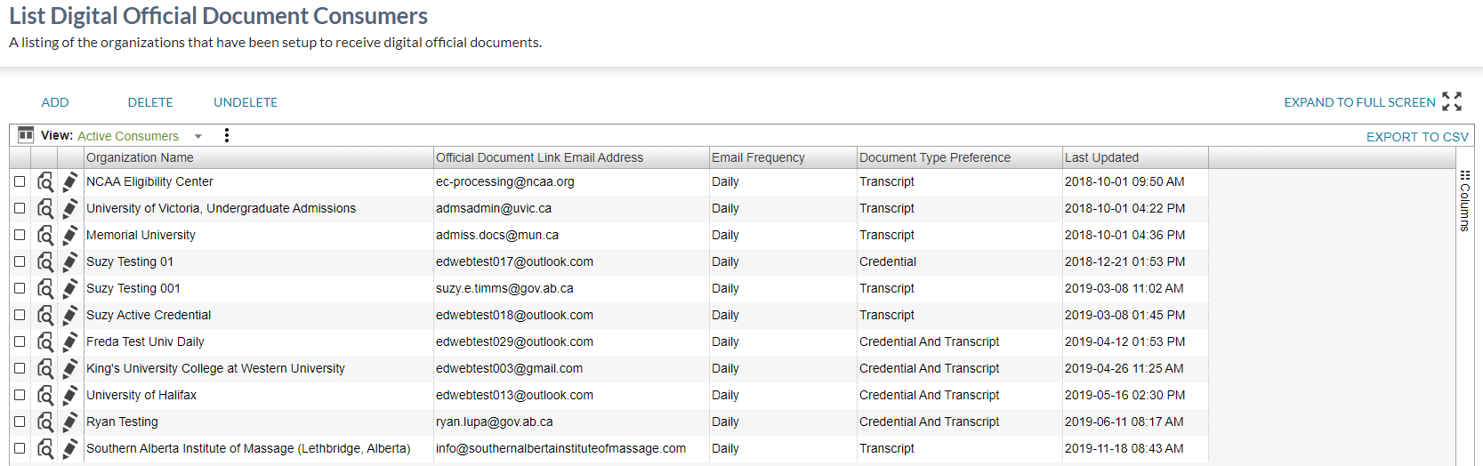 | Subtitle | A listing of the organizations that have been setup to receive digital official documents. |
