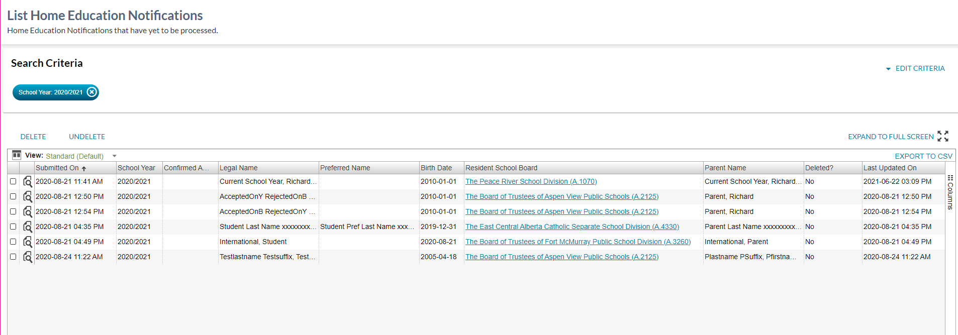 This view is used to display the outstanding Home Education Notification records that matched the search criteria. When using this view, the data in the grid filter to only show records where Is Deleted = False.