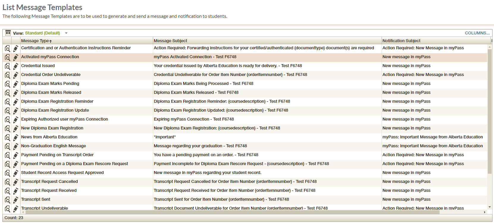 | {View Icon} | View icon that links user to the View Message Template Page. |
