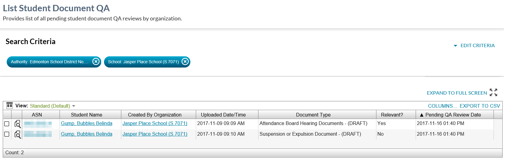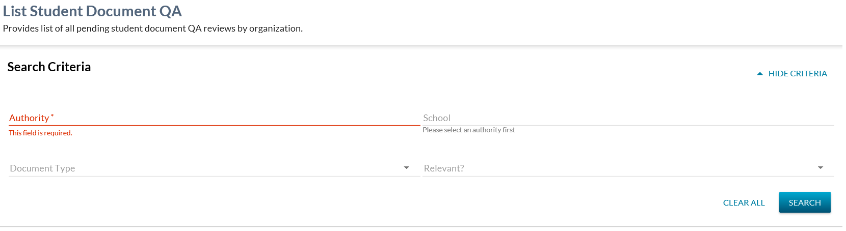 Where no value is selected, all Student Document Quality Assurance records are returned regardless of the student document’s IsRelevant value.