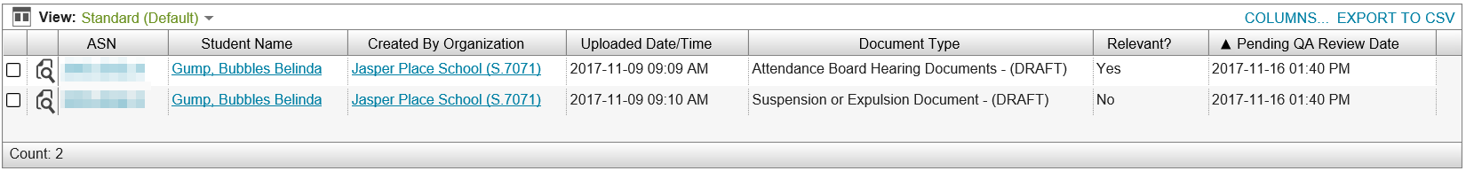 The following Student Document Quality Assurance information is available in this section of the screen: