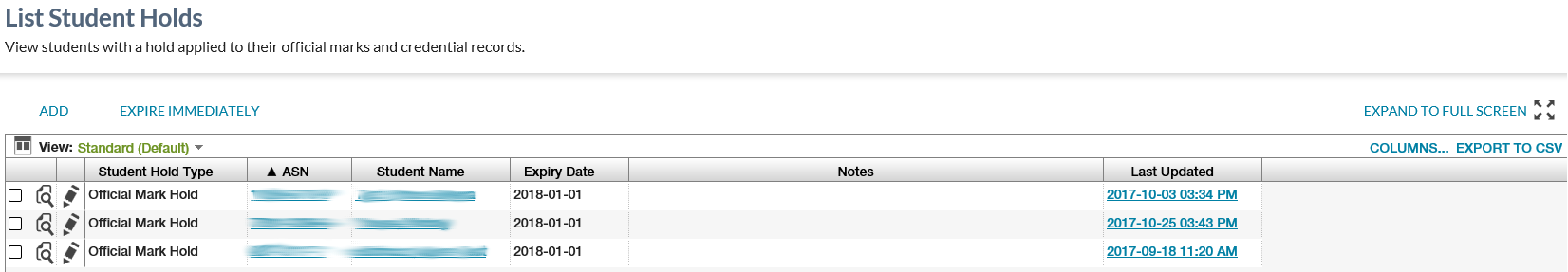 When user selects List Student Holds from the Admin navigation menu, PASIprep will retrieve and list all active Student Holds (where the expiry date is not in the past).