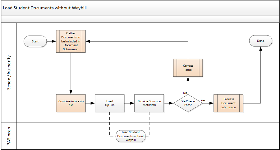 This process outlines the general process that a School/Authority user would follow to load student documents without a waybill, to Student Records in the document repository provided by a PASI Client.