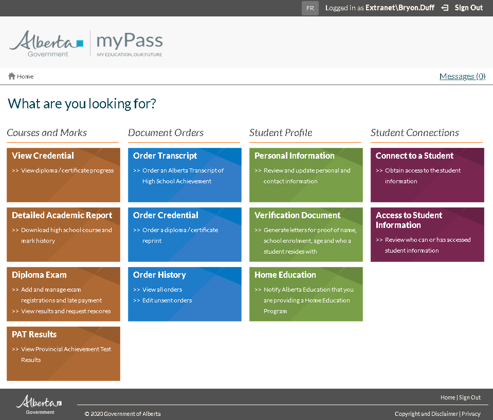 The myPass Homepage is the landing page for all myPass users and serves as the hub from which all myPass functionality is available. myPass is available to Students and Parents & Guardians in Public Mode, and to Authorized Users in Admin mode. For a more detailed explanation of these two modes of myPass please see the myPass Overview. For an overall myPass sitemap, please see the myPass Site Map page.