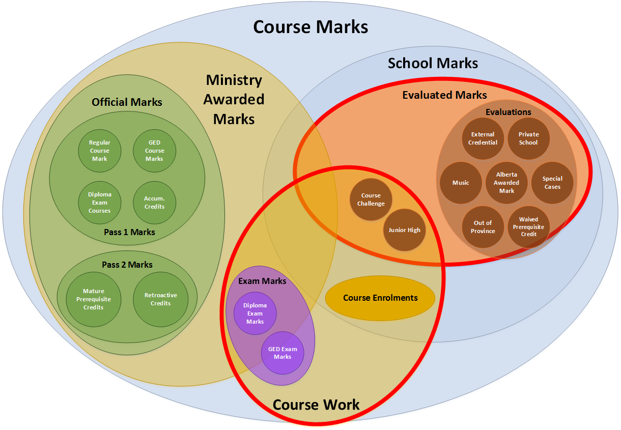 Official Marks for Course Work have mark values that equal those of their source marks. Course Work Official Marks for Diploma Courses can have a blended mark value (Diploma Exam and School Mark).
