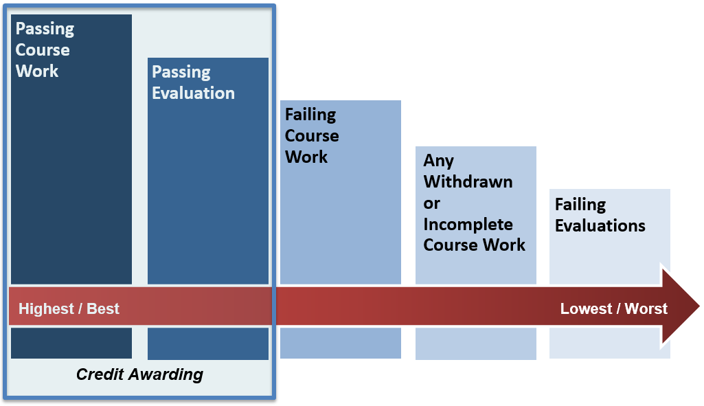 In general, official marks that are a product of course work are created and applied to a student’s record for a course when applicable. If no credit awarding course work can be calculated, a credit awarding evaluation may be assigned.