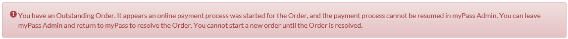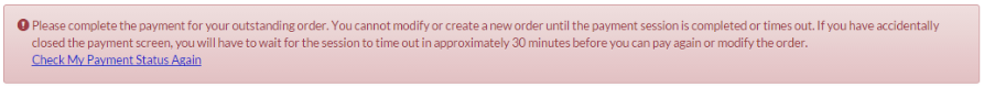 | In Progress | (Error Message) Please complete the payment for your outstanding order. You cannot modify or create a new order until the payment session is completed or times out. If you have accidentally closed the payment screen, you will have to wait for the session to time out in approximately {n} minutes before you can pay again or modify the order Note: {n} is the number of minutes remaining when EPS2 will determine the payment as being “Lost“ |