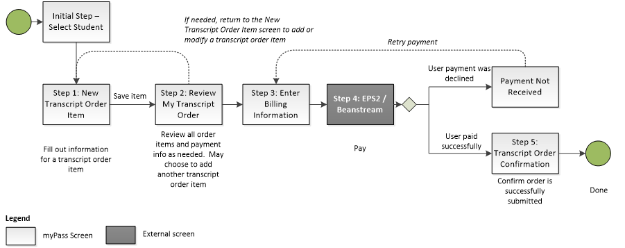 While this functionality is available in both the Public and Admin modes of myPass, the process can only be completed in the Public mode. Admin users that wish to order a transcript on behalf of a student should use the Add Transcript Order functionality in PASIprep.