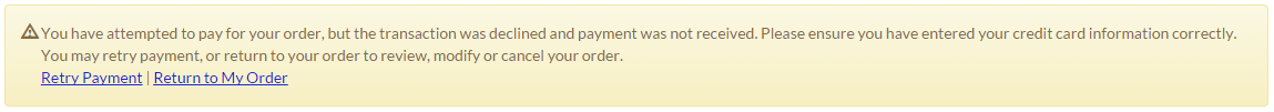 | Declined | (Warning Message) You have attempted to pay for your order, but the transaction was declined and payment was not received. Please ensure you have entered your credit card information correctly. | None |