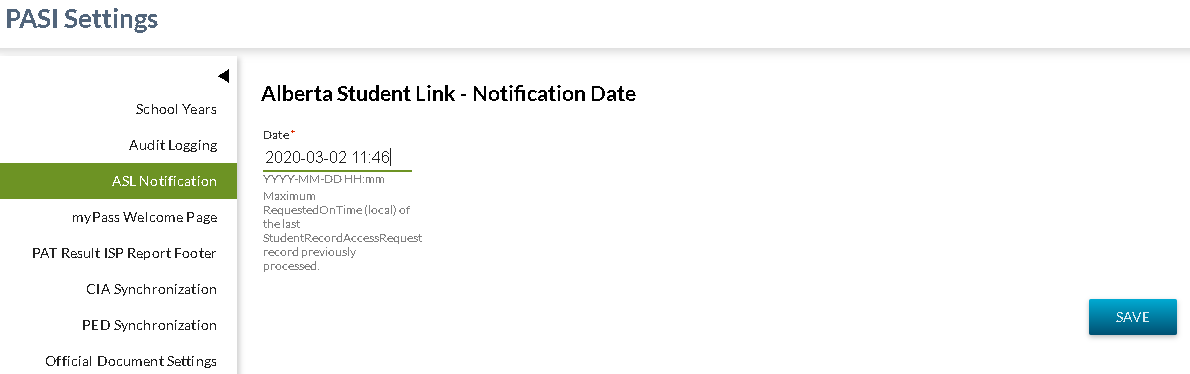 The ASL Notification tab allows PASI users to view and adjust the current ASL Request Notification date information. This screen will support the PASI project team from a technical perspective to provide them with greater visibility and control when implementing and testing the ASL notification functionality as well as for managing this information moving forward.