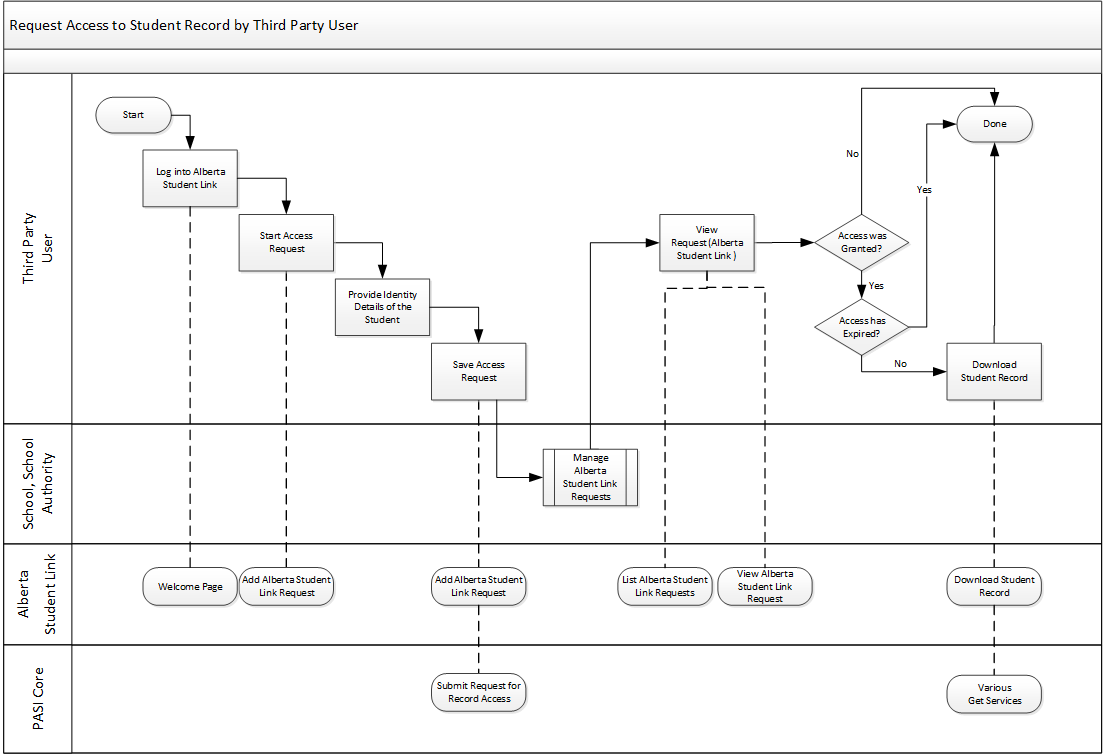 This process outlines the general process that a third party user would follow to request access to a Student’s Record using the Alberta Student Link website.