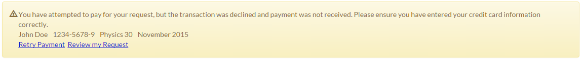 (Warning Message) You have attempted to pay for your request, but the transaction was declined and payment was not received. Please ensure you have entered your credit card information correctly. |