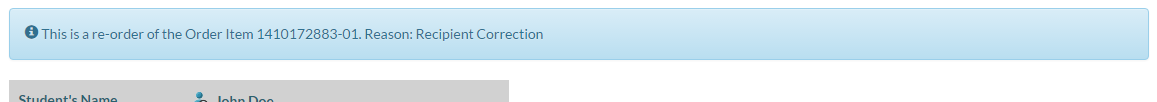 If the Document Order contains a Reorder Document Order Item, the Reorder Panel will appear above the Transcript Order Student Panel to show the Reorder Of Document Order Item data element. See Reordering for more details on reordering.