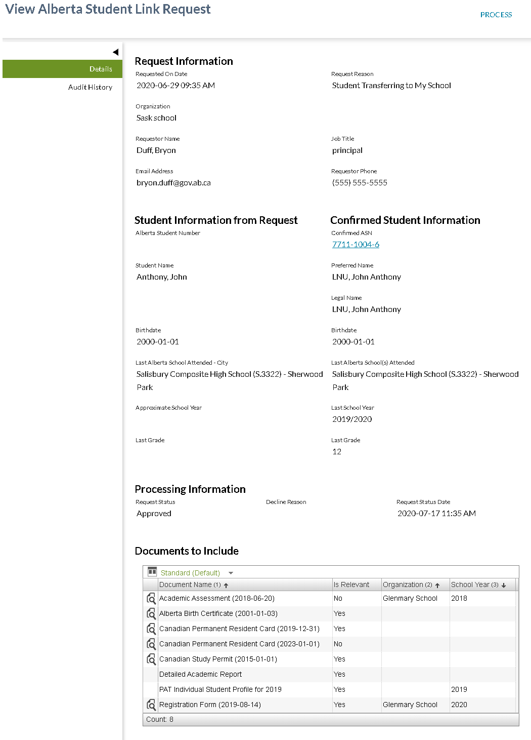 | PROCESS | Opens the Process Alberta Student Link Request page. | The action will be visible if the user has PASIprep Level 47 Permission - Manage Student Document Access Requests and meets the student document data access rules. Note: This action is not available when the Request Status is ‘Cancelled’, or ‘Downloaded’ or ‘Expired’ |