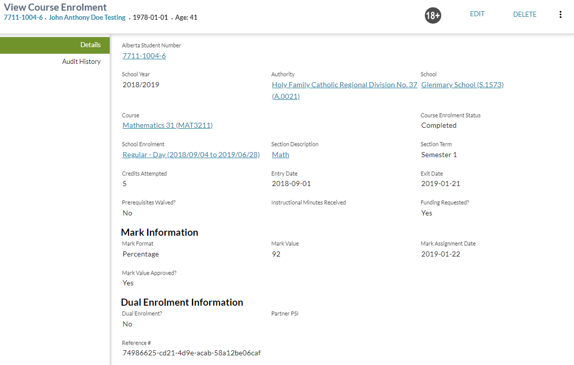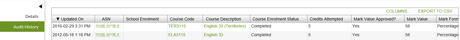 Alberta Student NumberDisplays the ASN on the record (which may be the secondary ASN)