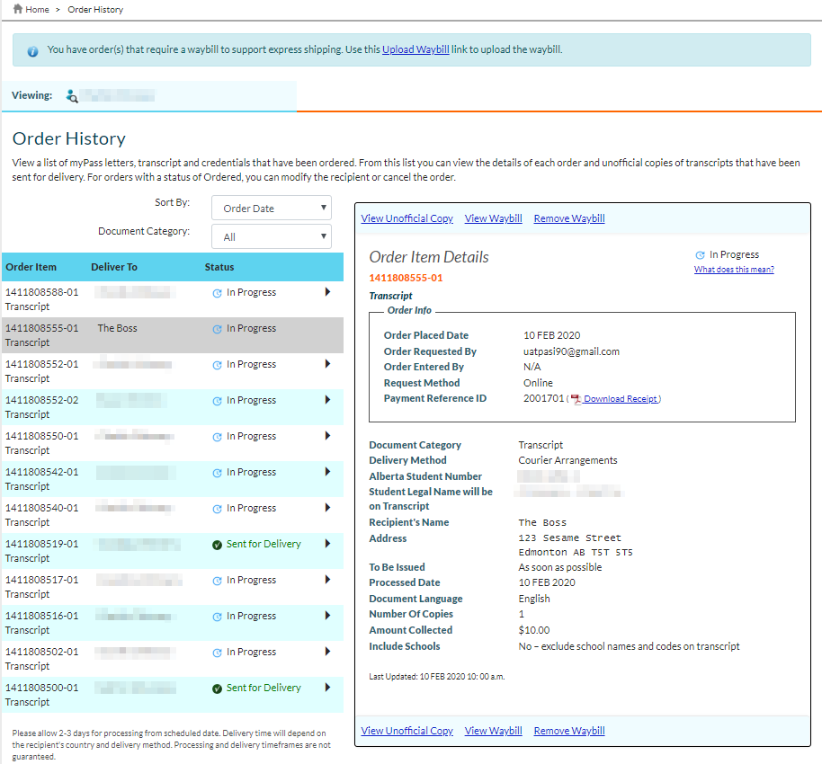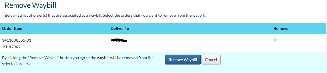 The student is presented with this page by clicking the “Remove Waybill” link on the “Order History” page.