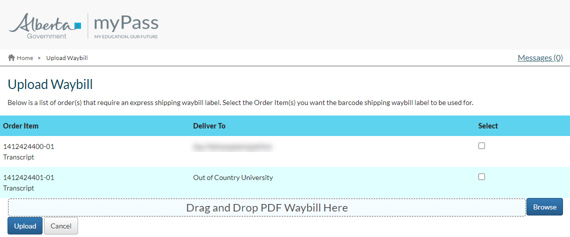 Clicking the Upload Waybill link will open the Upload Waybill screen